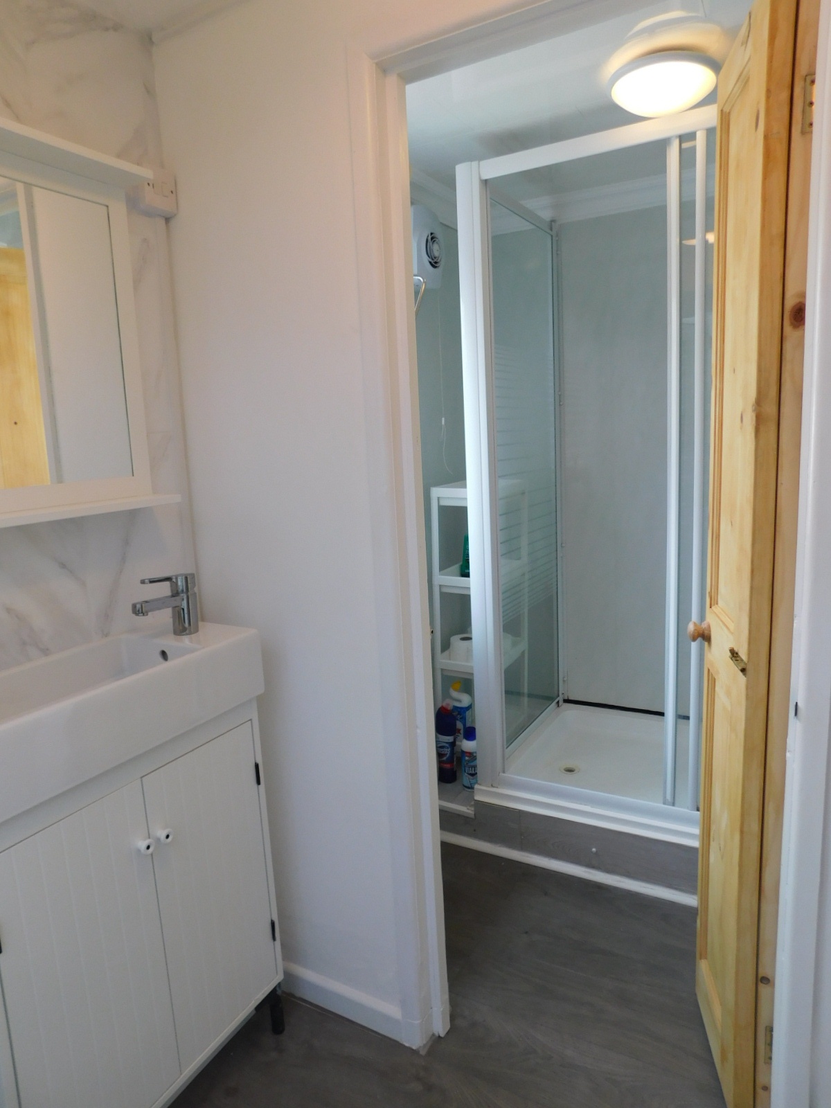 Fully tiled, shower cubicle, electric shower, extractor fan