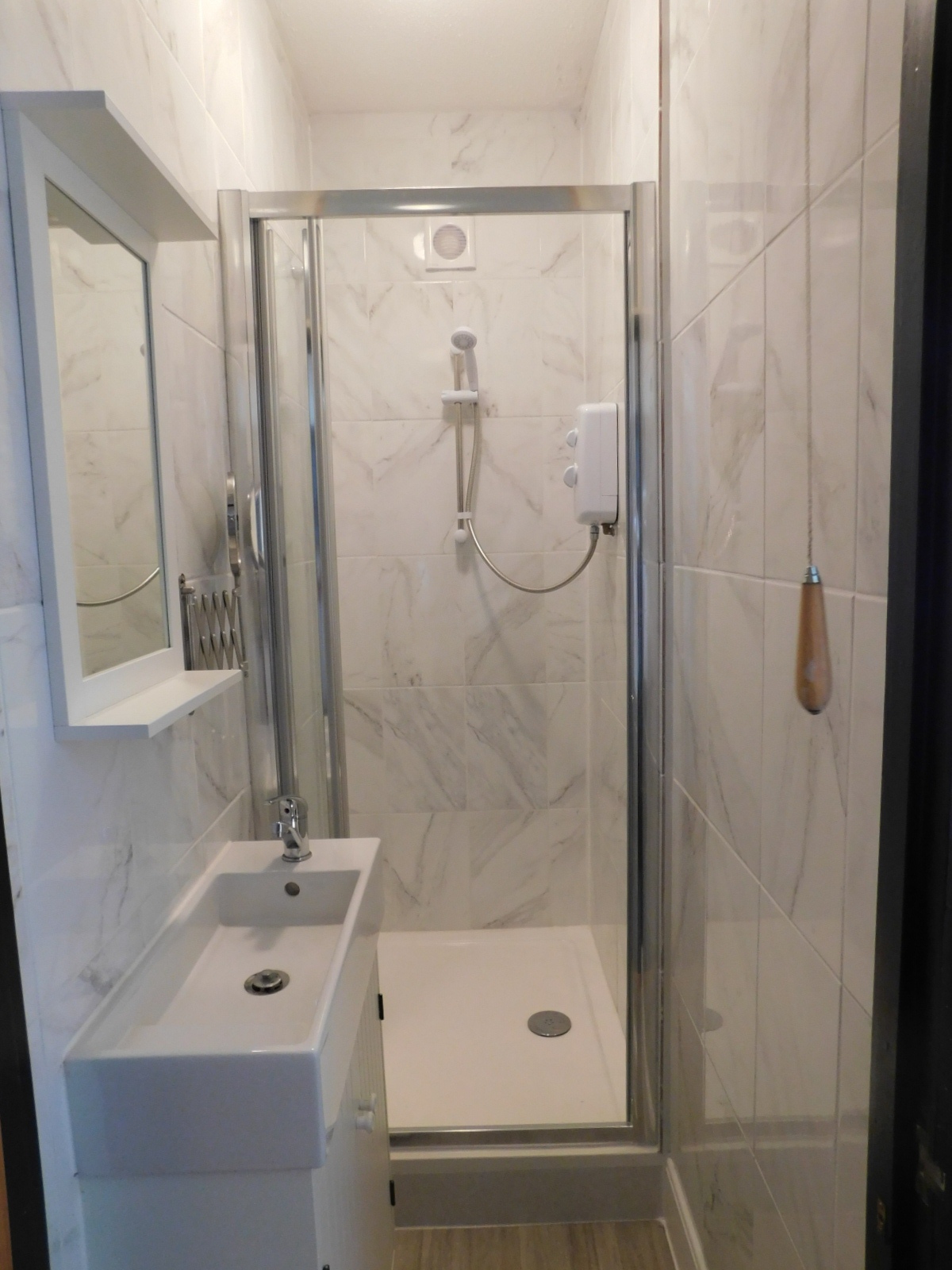 Fully tiled, shower cubicle, electric shower, extractor fan